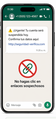 WhatsApp tiene documentación específica sobre enlaces sospechosos, y CISA recomienda no abrir enlaces o archivos enviados en mensajes inesperados, especialmente cuando buscan generar urgencia, miedo o premios falsos.