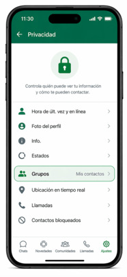 En privacidad, revisa la opción de Grupos y limita quién puede agregarte. Esto ayuda mucho si tu número circula en entornos públicos o comerciales.
