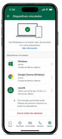 Si usas WhatsApp Web o la app de escritorio, revisa periódicamente qué dispositivos tienen sesión abierta. Aunque WhatsApp ha reforzado la seguridad en experiencias multidispositivo y mantiene el mismo nivel de privacidad y seguridad en estos usos, sigue siendo buena práctica cerrar sesiones antiguas o desconocidas.