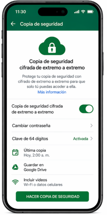 WhatsApp ofrece copias de seguridad cifradas de extremo a extremo protegidas con una contraseña o con una clave de 64 dígitos. WhatsApp aclara que esa contraseña o clave es la única forma de acceder a la copia cifrada o transferirla a otro dispositivo.