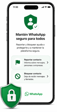 WhatsApp indica que reportar mensajes, personas o empresas ayuda a mantener la plataforma segura, y que también puedes bloquear contactos para dejar de recibir mensajes y llamadas.
