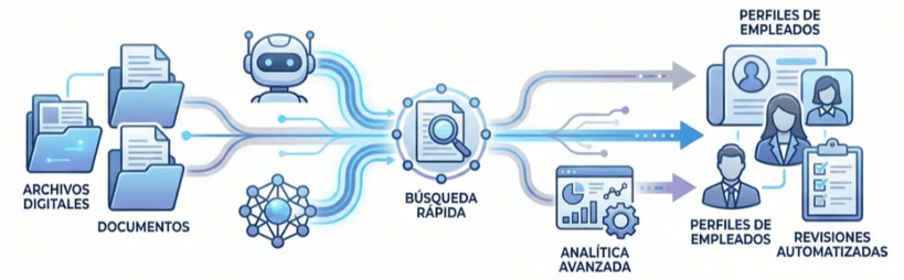 Uno de los mayores aportes de la IA en Recursos Humanos es la transformación de los expedientes tradicionales en sistemas inteligentes de consulta y análisis.